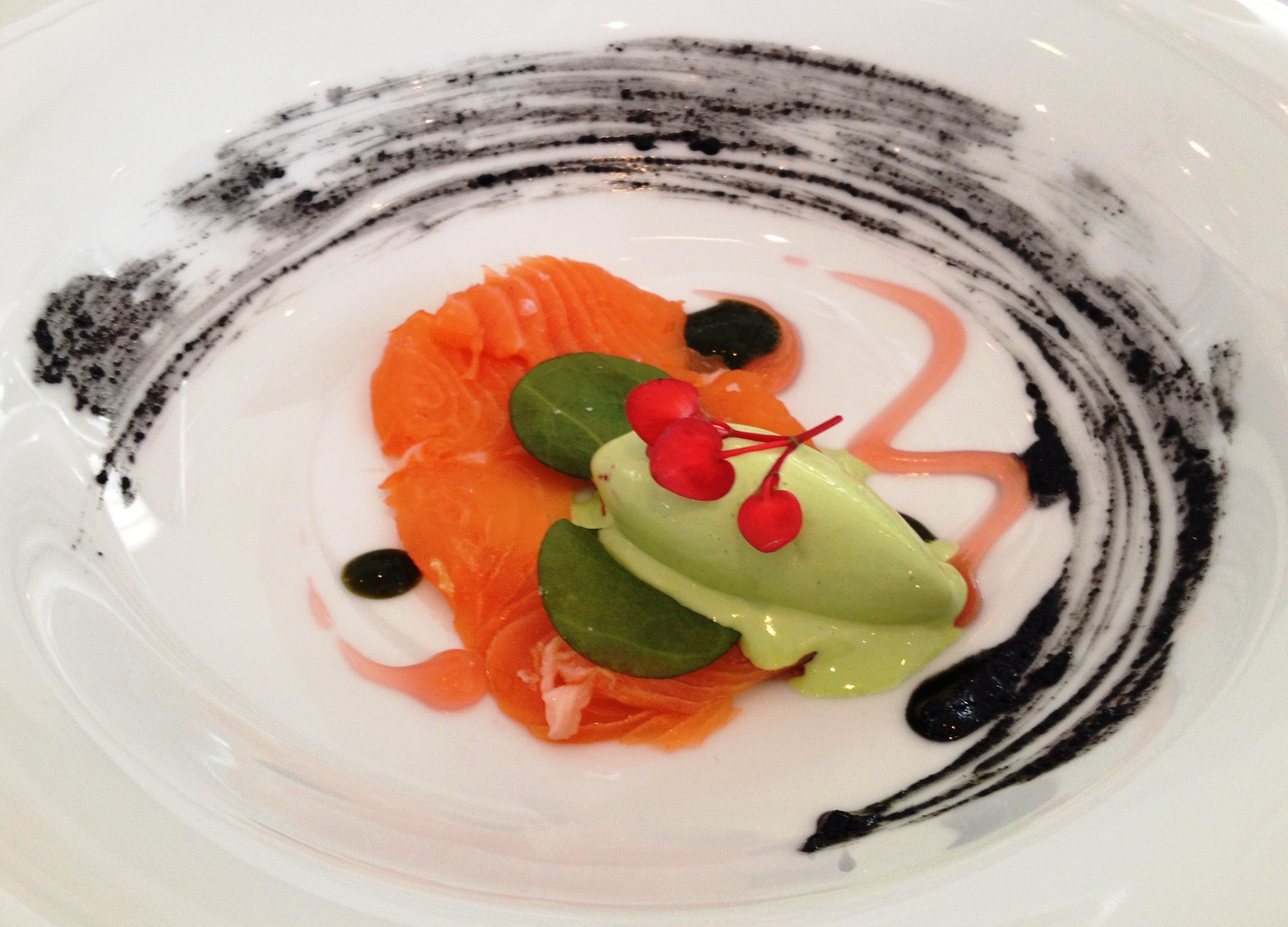 Czosnek niedźwiedzi – zioło odkryte dzięki Amaro, niezwykle aromatyczne, pobudzające apetyt i zmysły, można połączyć z grzybami, ślimakami, mięsem. Można podać lekko zblanszowany lub po prostu w formie aromatycznego pesto. Rośnie, w polskich lasach od wieków. Obecnie pod ochroną, ale w lepszych sklepach ogrodniczych bez problemu można dostać sadzonki tej rośliny, która wyrośnie w naszym ogrodzie lub doniczkach. Tak zaczyna się kulinarne show w restauracji Amaro. Przez przystawki z których na szczególną uwagę zasługuje łosoś z kąpieli wodnej podany z lodami ze szczypiorku i zwęglonym porem.
