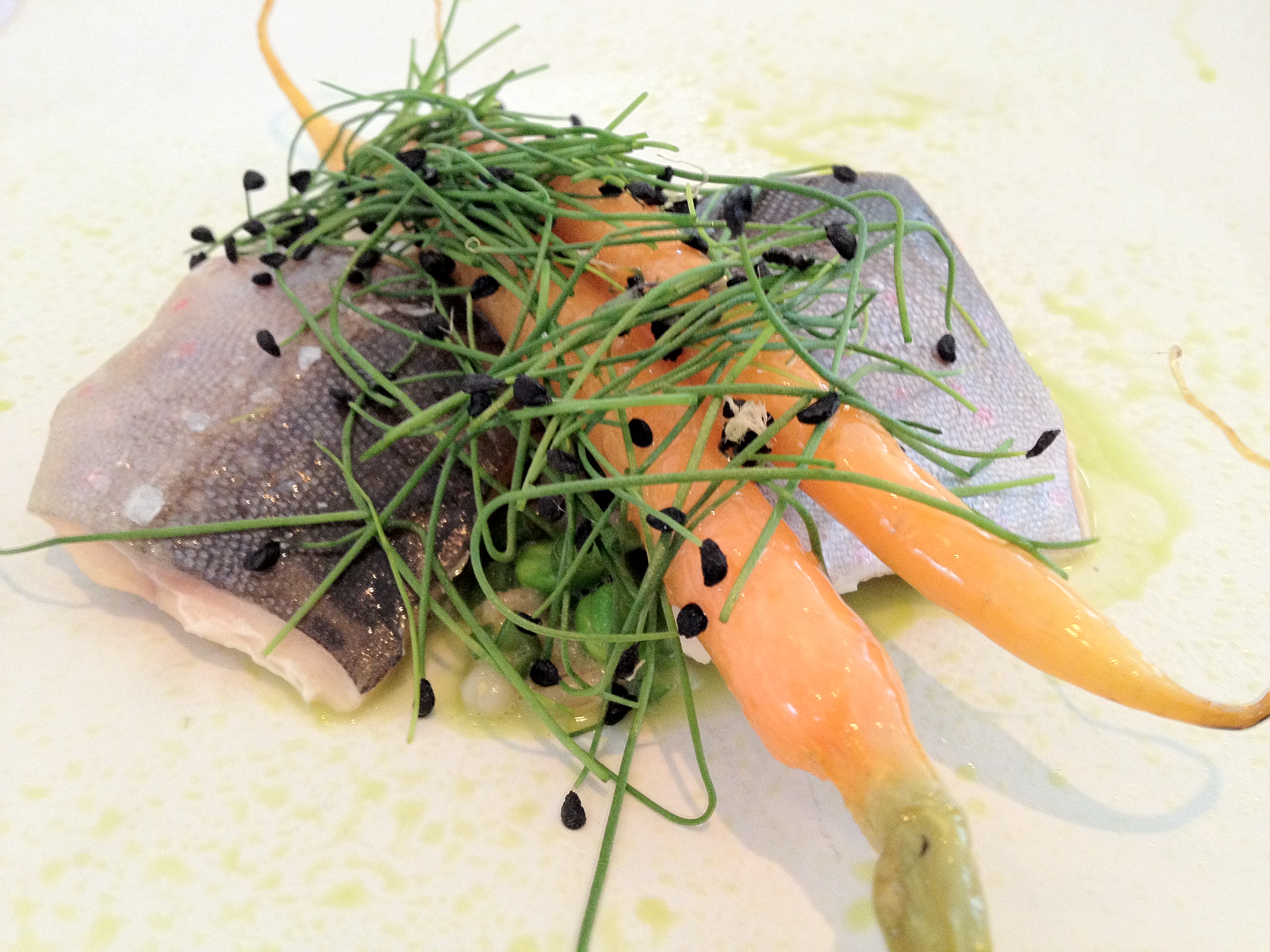 I w końcu danie główne, czyli pstrąg na ekstrakcie z mchu leśnego, ze szczypiorkiem czosnkowym i młodymi marchewkami uduszonymi na maśle.