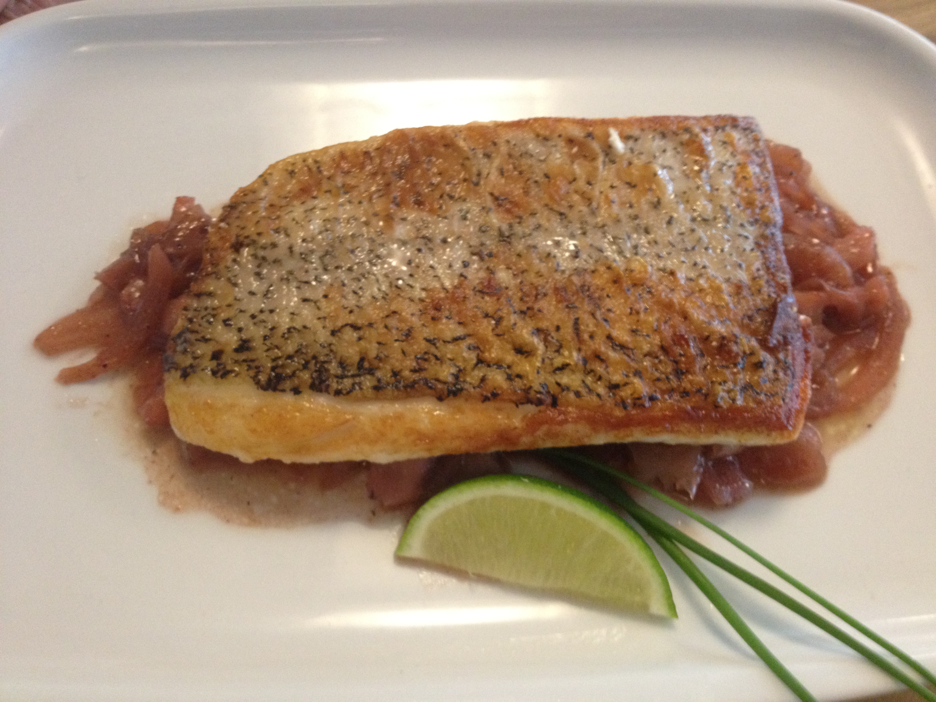 Danie główne. Pyszny sandacz, podany na koprze włoskim z sokiem z granatu. Naprawdę mistrzowskie połączenie świeżej, delikatnie przyrządzonej ryby ze smakiem granatu i kopru.