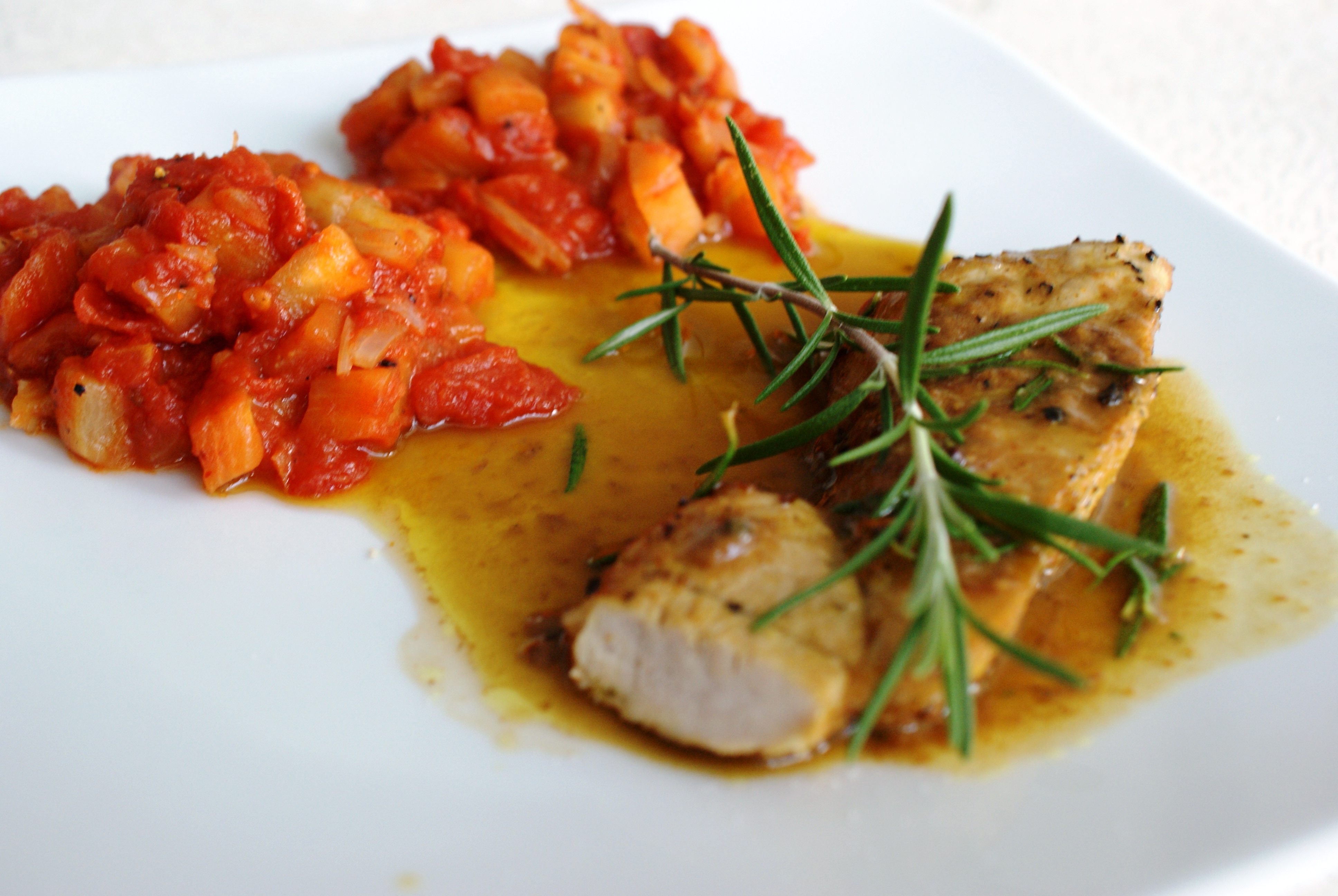 Brzmi dosyć skomplikowanie, ale przygotowanie tego pysznego dania, po zjedzeniu którego wylizuje się do ostatniej kropli sos, sięgając po ostatnie skrawki pieczywa, jakie zostało w domu, zajęło mi zaledwie 30 minut. Nie licząc oczywiście marynowania przez noc cielęciny w oliwie, cytrynie soli i pieprzu. A zatem jak wygląda 30 minut w kuchni przed obiadem? Cielęcinę umieszczam w naczyniu żaroodpornym, wypełnionym na dnie bulionem warzywnym z oliwą, cytryną, dwoma ząbkami czosnku i wstawiam do piekarnika o temperaturze ok. 160 stopni na 30 minut. W tym czasie kroję bakłażana w kostkę, posypuję solą i zostawiam na kilka minut na sitku, po czym spłukuję zimną wodą. W tym czasie na patelni szkli już się ząbek czosnku i cebulka pokrojona w drobna kostkę do której dorzucam opłukanego bakłażana i duszę chwilę, po czym zalewam połową szklanki białego wina, pozwalając aby alkohol odparował. Posypuję słodką papryką i dodaję dwa dojrzałe pomidory pokrojone w kostkę lub małą puszkę pulpy pomidorowej. Duszę chwilę, doprawiam do smaku sola i pieprzem. Cielęcinę wyjmuję z piekarnika. Powstały sos przelewam do blendera, dodaje świeży rozmaryn, pół łyżeczki musztardy i miksuję wszystko na jednolity, klarowny sos, którym polewam mięso. Do zobaczenia w ogrodzie!
