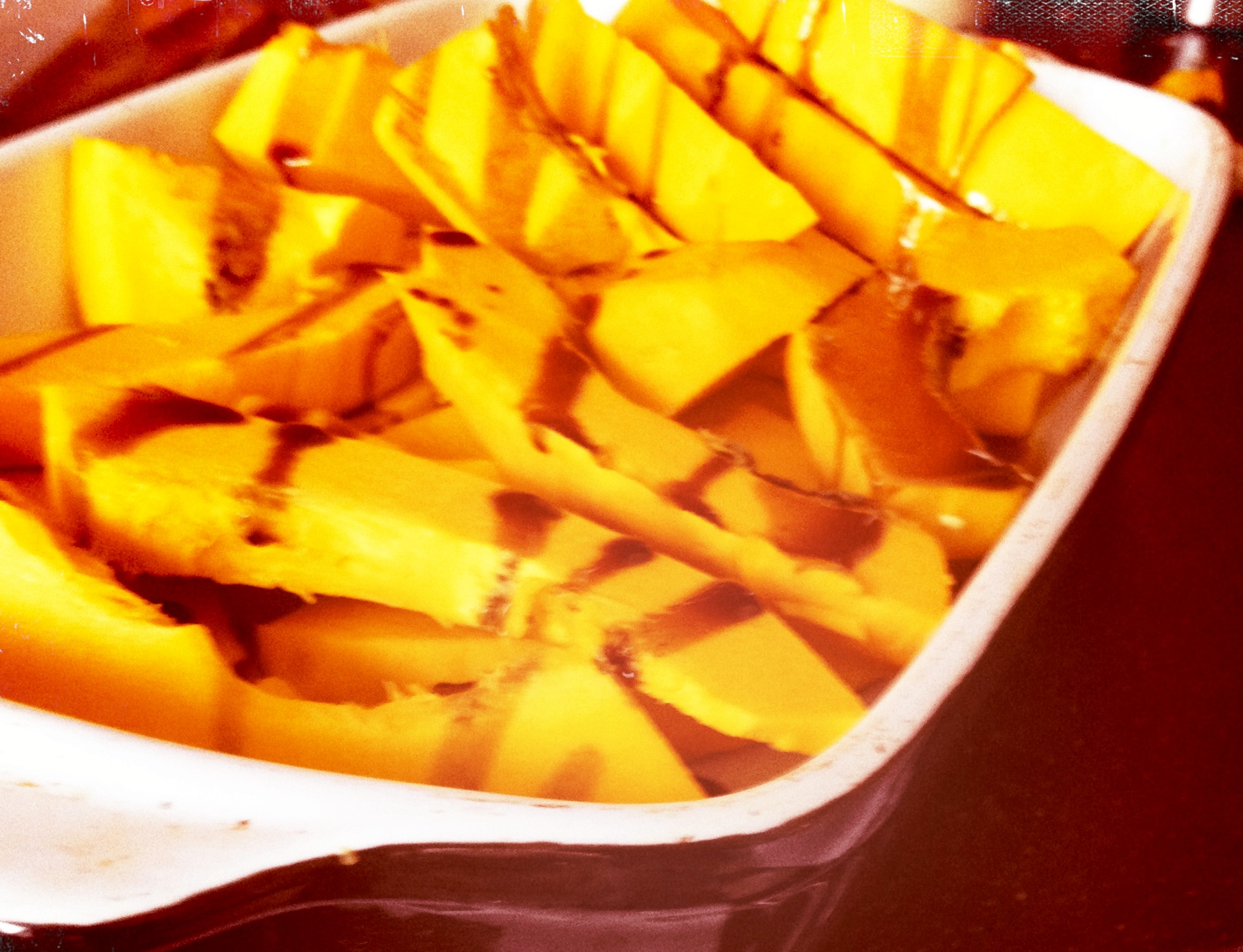 Kawałki dyni zapiekam najpierw w piekarniku, razem z imbirem, wyfiletowaną pomarańczą, plasterkami świeżej papryczki chili. Wszystko polewam olejem z pestek dyni, który nada potrawie wyrazistego orzechowego smaku. Pamiętam, że Magda Gessler w swoim przepisie, zapiekała wszystkie składniki w naturalnej, dyniowej wazie, która powstała po wybraniu całego środka z dyni. Ja tym razem wybrałem małą dynię, więc o wazie nie było mowy.