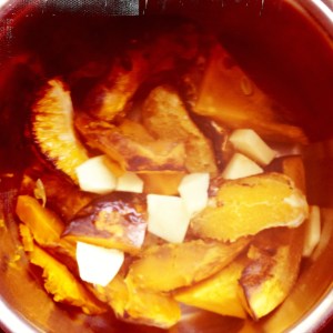 Wszystko zostawiam w piekarniku na dwadzieścia minut w 180 stopniach. Zapieczone skaładniki przekładam do garnka, zalewam bulionem, doprawiam solą i doprowadzam do wrzenia. Wszystko miksuje na jednolitą masę, dolewam mleczko kokosowe, starty ser gruyer, gałkę muszkatołową, a koniak zastępuję ciemnym rumem. Jeszcze raz doprawiam solą i pieprzem. Podaję z kilkoma kroplami oleju z pestek dyni.