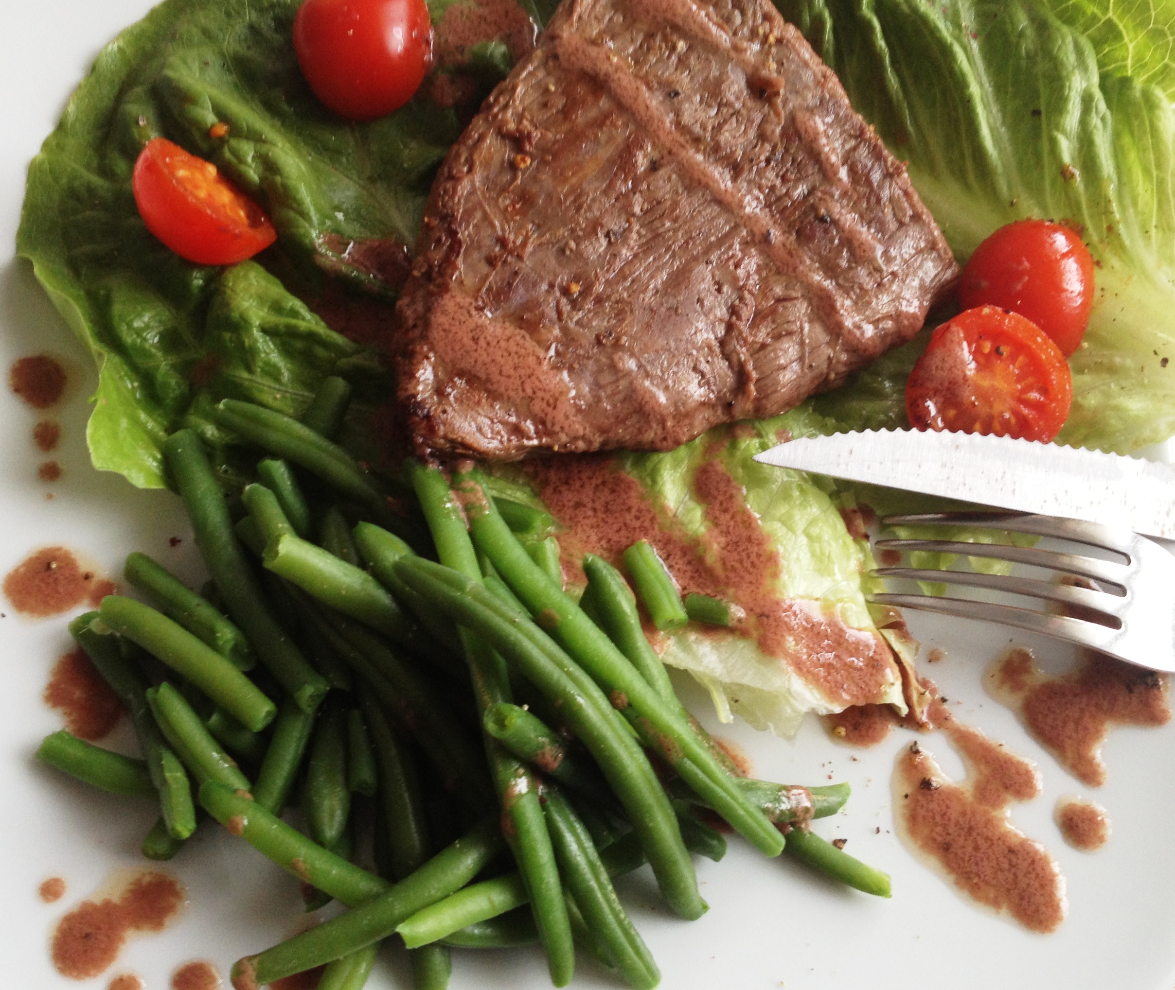 brasseA wracając do befsztyku Bavette. Podałem go z młodą fasolką na rzymskiej sałacie. Z doskonałym winno musztardowym sosem, który powstał przez zdeglasowanie tłuszczu po usmażeniu steków za pomocą czerwonego wina, połączonego z dwiema łyżkami masła i łyżką musztardy Dijon. Jedyną trudnością przygotowania tego sosu, jest problem z odpowiednim połączeniem składników, które w łatwy sposób mogą się zważyć. Zasada prowadząca do aksamitnego sosu, jest prosta, wino odparować z alkoholu, utrzymywać sos na bardzo wolnym ogniu a najlepiej w kąpieli wodnej, cały czas mieszać zawartość, najlepiej przy użyciu trzepaczki.