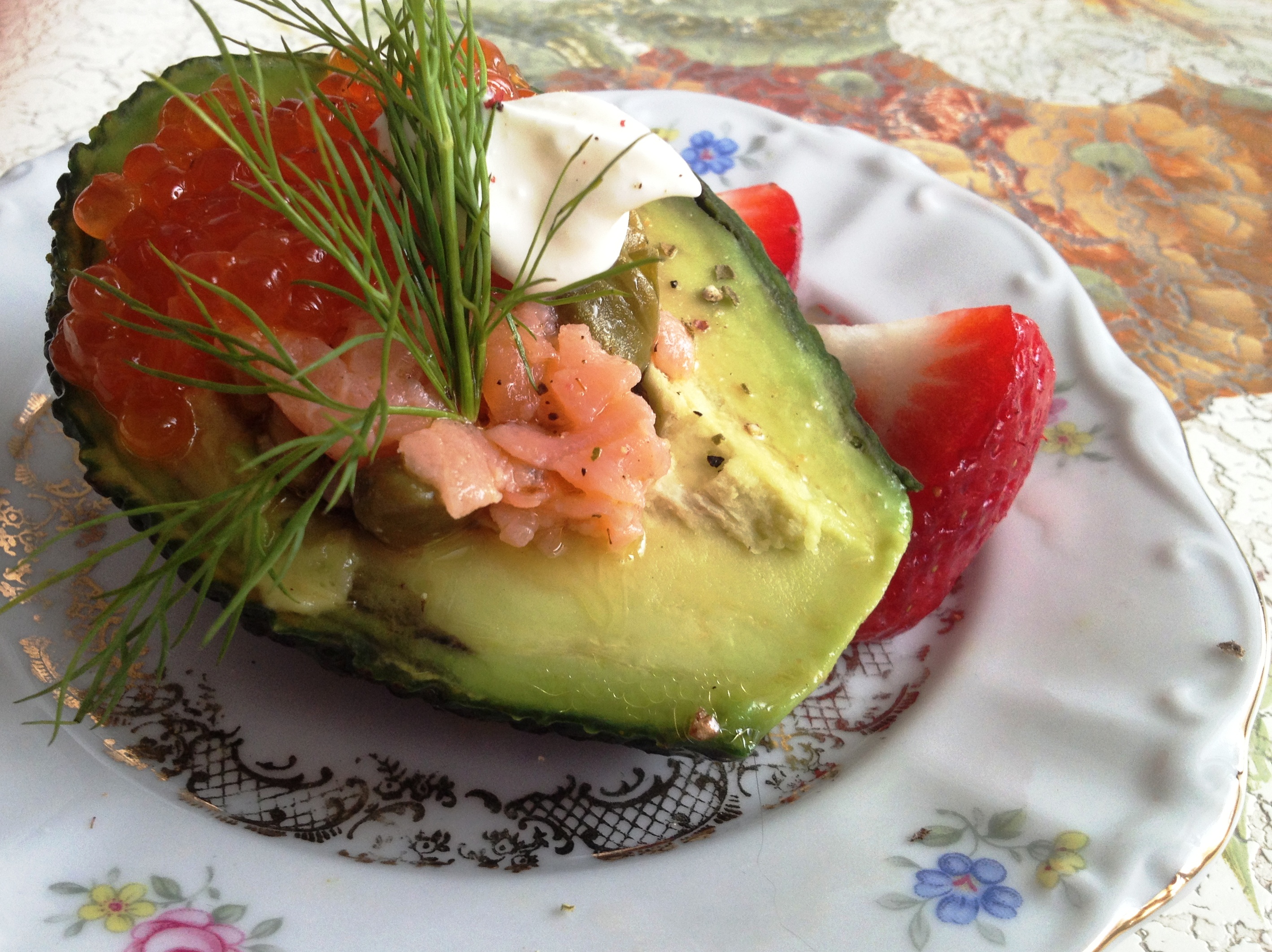 Minęło kilka lat, w mojej lodówce znalazła się puszka z czerwonym kawiorem. Czekała na odpowiedni moment, czekała, aż zrozumiem do końca ten smak, którego nie można zepsuć. Kwaśna śmietana jest oczywiście doskonałym partnerem czerwonego kawioru. Postanowiłem jednak nie zatrzymywać się jedynie na tym prostym, znanym mi już połączeniu i tak powstała w mojej głowie, niedzielna, śniadaniowa przystawka. Avokado z łososiem i kawiorem.
