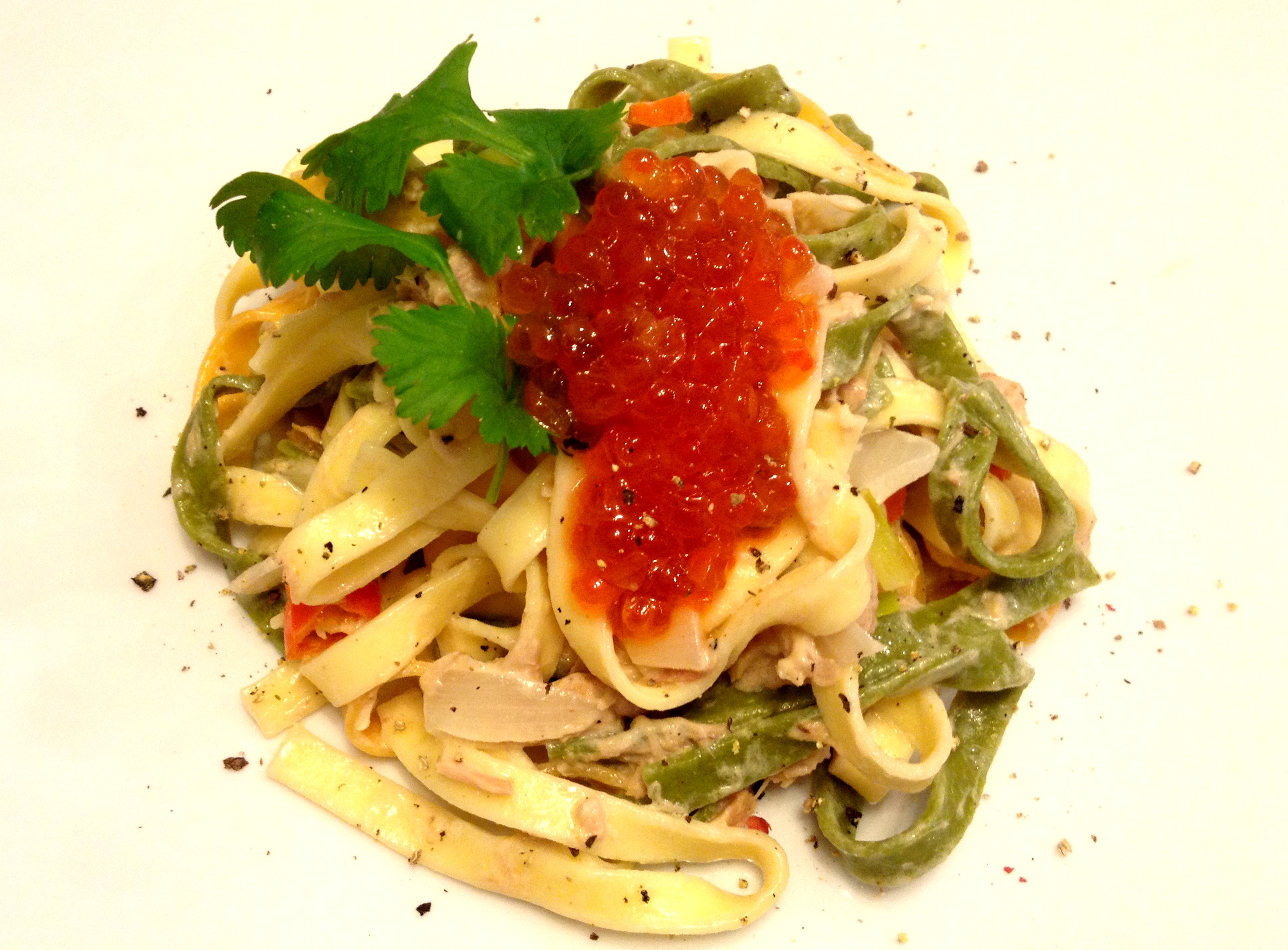 A na lunch, bo kawior pozostał w puszce, tagliatelle z tuńczykiem i chili. Prosty, śmietanowy sos, na bazie dymki i chilli z tuńczykiem i dwiema łyżkami gęstej śmietany kremówki. Całość na talerzu wykończona kawiorem i listkami kolendry. Bardzo przyjemny w odbiorze smak. Słony kawior zastąpił parmezan, stając się jednocześnie dominującym smakiem potrawy.