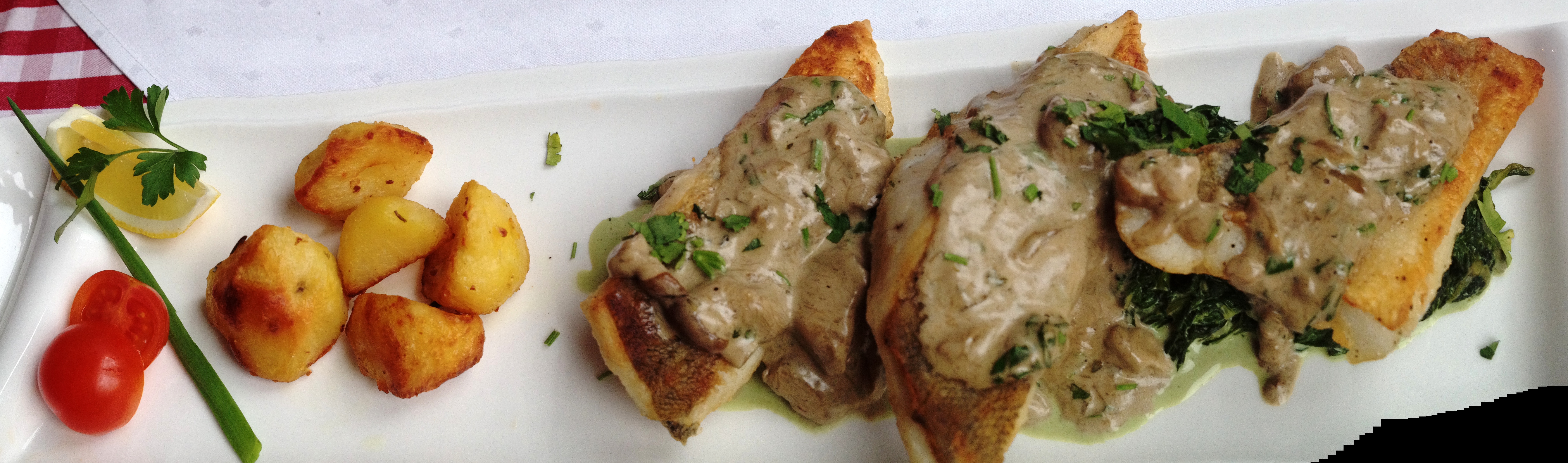 W końcu zupa rybna, pyszna, wzbogacona oliwkami i kaparami, delikatnie ostra i rozgrzewająca. Czas na dania główne. A wśród nich między innymi Sandacz w sosie borowikowym, podany na szpinaku. Bardzo dobrze i oryginalnie przygotowanym szpinaku z odrobiną wyczuwalnego pora. Do tego specjalnie przygotowane i dobrane ziemniaki opiekane w piecu.