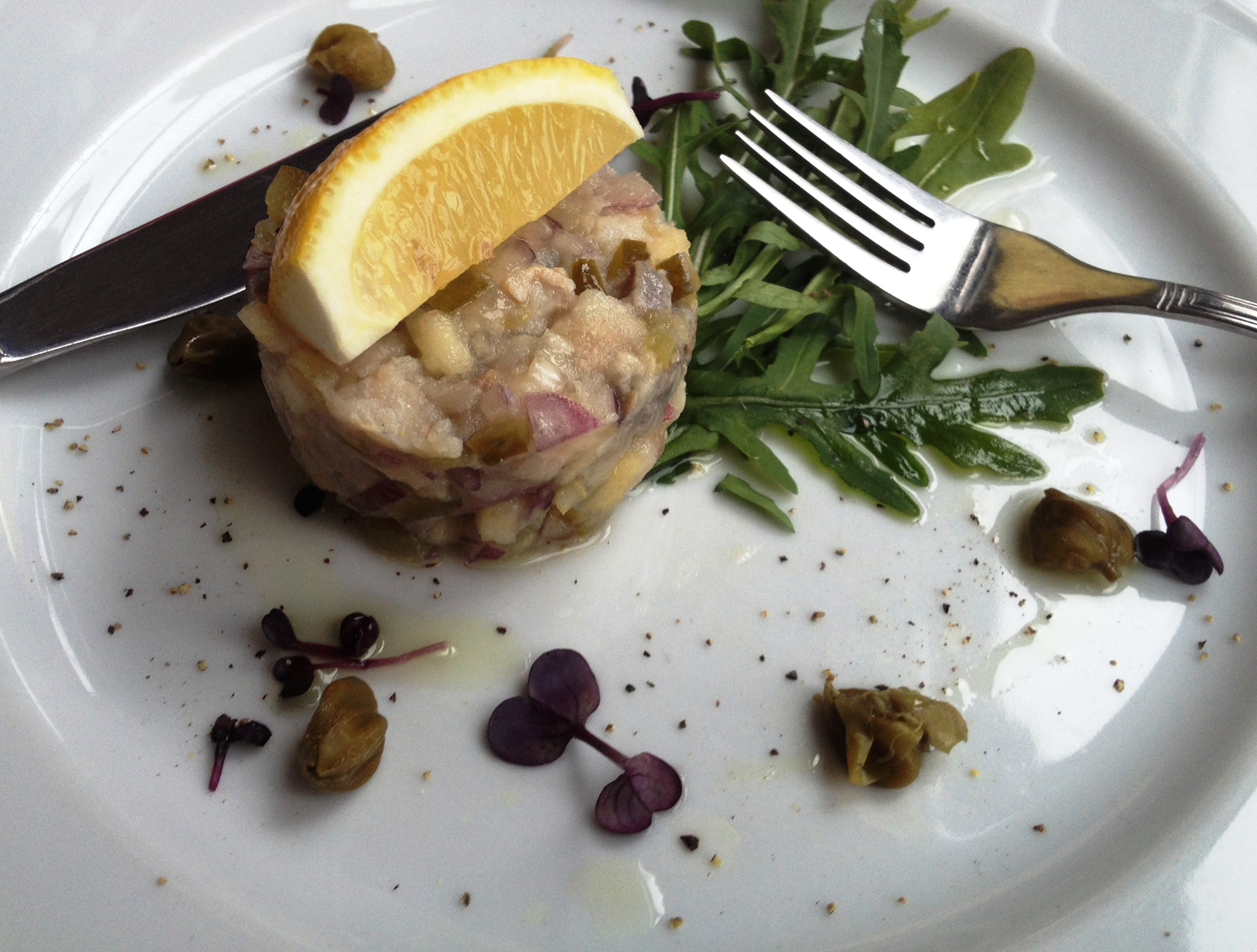 I tak znalazłem, czytając wcześniej, przeglądając opinie i fora restaurację Bulaj w Sopocie. Trochę oddaloną od zgiełku molo i centrum, przy samej plaży, w niewielkim budynku, pięć minut spacerem od Grand Hotelu. W pierwszej chwili poczułem się trochę niepewnie. Jest początek kwietnia, a restauracja właściwie świeci pustkami. To nie jest dobry znak pomyślałem w pierwszej chwili, ale chwile później uświadomiłem sobie, że odwiedzam to miejsce w zimny, wiosenny dzień, poza weekendem. Zmieniłem zdanie, kiedy podano przystawki, racząc nas kilka minut wcześniej wódką jęczmienna, pojedynczej destylacji. Nie lubię wódek ale to była poezja nie wódka i jeśli ktoś w Polsce wam powie, że pija tylko dwudziestoletnią whisky, to znaczy, że nie poznał nigdy cudownych staropolskich wódek, które nie maja nic wspólnego z tym co możemy kupić w sklepie alkohole 24, bo ten napój pachnie, ma bukiet polskiej, letniej łąki, kwiatów i owoców. Naprawdę mamy się czym chwalić. Wracając do przystawek. Tatar ze śledzia genialny, prosty, z bardzo delikatnie wyczuwalnym olejem, chyba słonecznikowym, ale nie była to oliwa, bo to polski śledź i tatar, nie mający nic wspólnego z popularnym matijasem tak przez nas kochanym.