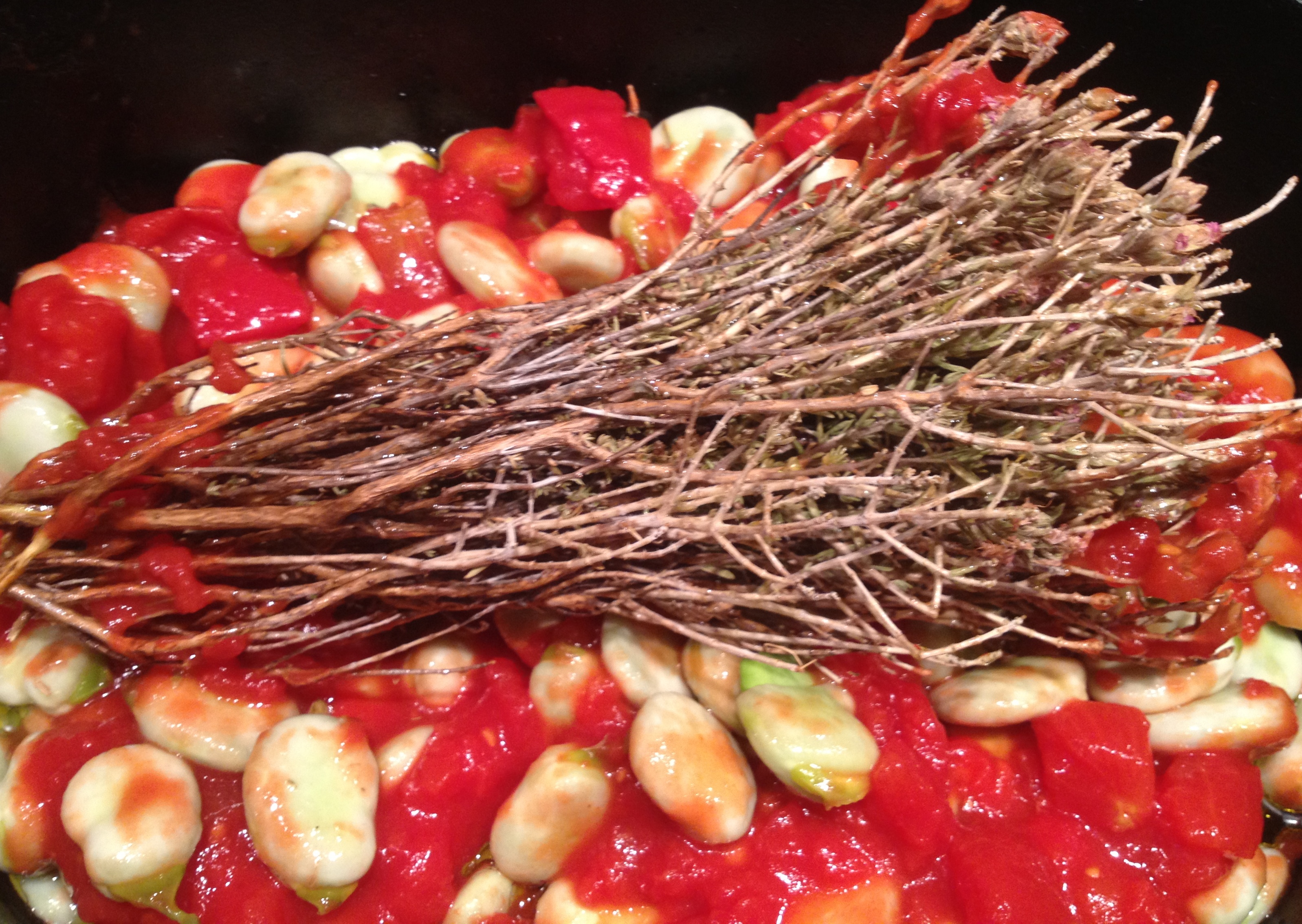 Mi natomiast przypomniał się grecki przepis na gulasz z bobu, młodego bobu pływającego w sosie z białego wina, ouzo i oliwy z bardzo wyraźnym akcentem suszonego tymianku. Tymianek w tym przepisie pachnie zupełnie inaczej. Przykryty, pod żeliwnym naczyniem ułożony na pływającym bobie wydziela tak niesamowity aromat pod wpływem wina i i ouzo, że mieszkanie zamienia się w jednej chwili w dziką, grecką łąkę. Zapewniam, że wrażenia przed konsumpcją tego dania zaskoczą wszystkich, którzy znajda się w promieniu kilkunastu metrów od naszego piekarnika.