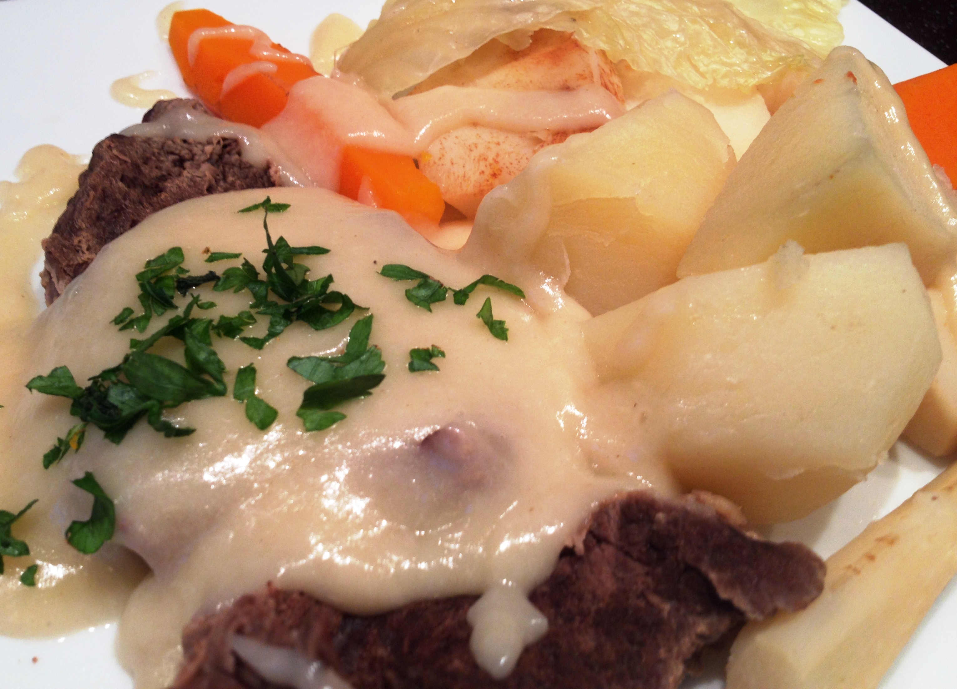 A przygotowanie sztuki mięsa, polega na powolnym gotowaniu mięsa wołowego z rozmaitymi włoszczyznami, tak aby bulion z niego był smaczny. Bo bulion stanowi integralną część sosu chrzanowego na maśle, który doskonale łączy się z wołowiną.