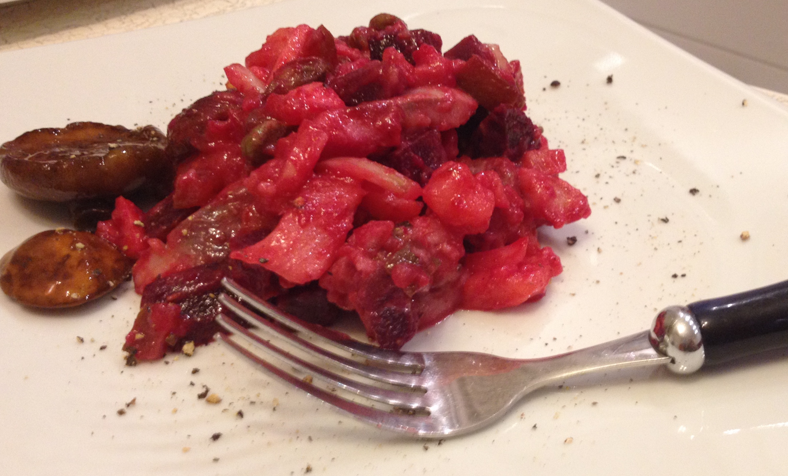 Podstawą tej sałatki są buraki i śledzie. Buraki ugotowane al dente, pokrojone w kostkę i śledziowe paski. Buraki łączymy ze wszystkimi sładnikami i odstawiamy, najlepiej na dwie godziny, aby puściły sos i połączyły smaki wszystkich składników. W tym czasie robimy sos, klasyczny sos winegret, czyli oliwa, ocet, miód, sól i pieprz połączone w jednolity balsam. Sos musi mieć kwaśno słodki smak, nie ma sensu podawać dokładnych proporcji, trzeba próbować i uczyć się smaku doskonałego winegretu.