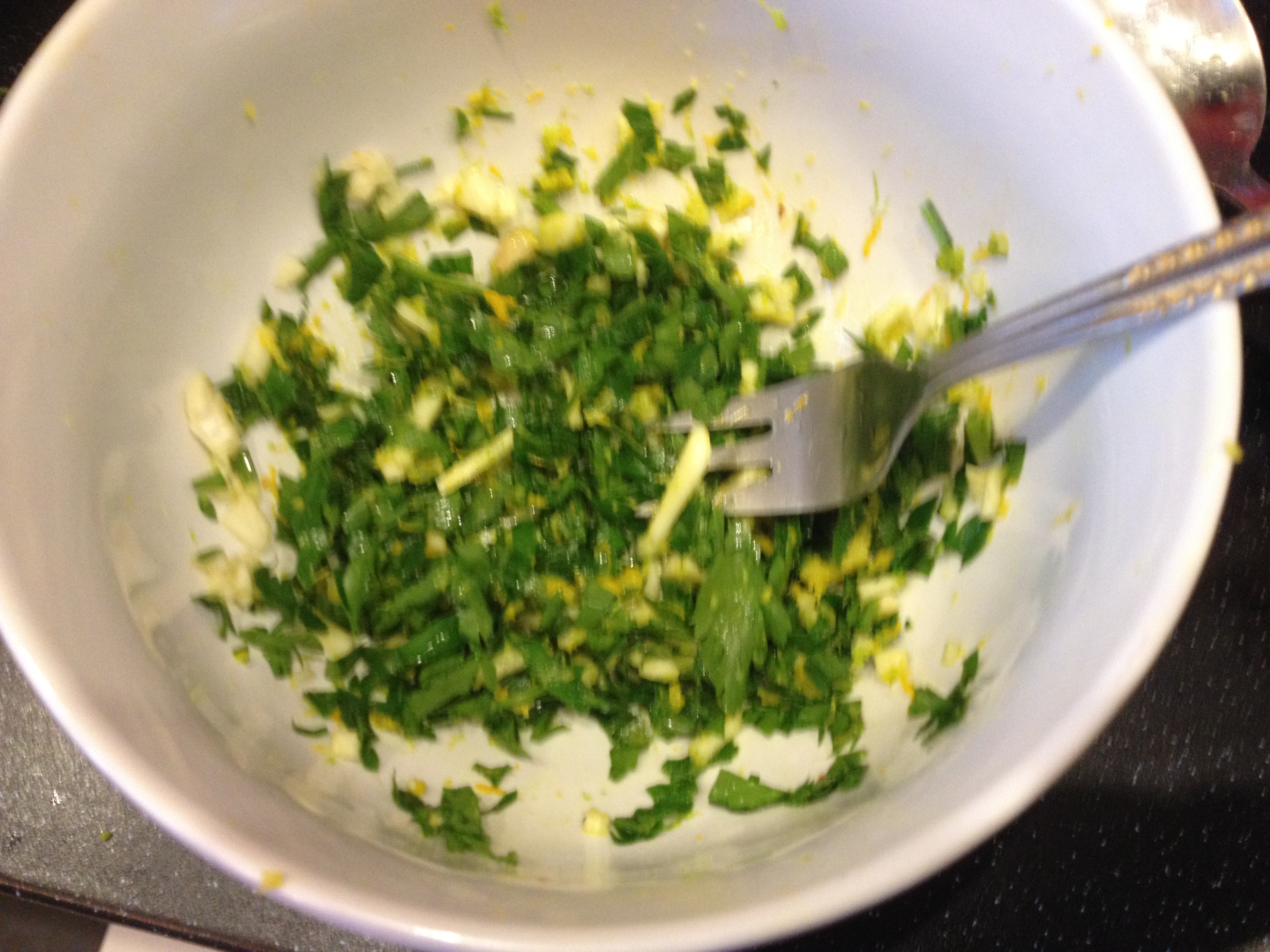 W czasie pieczenia przygotowujemy granolattę, czyli niezwykle aromatyczna pastę z pietruszki, czosnku i skórek cytrusowych. Można przygotować w moździerzu uzyskując tym samym bardziej intensywny aromat pasty.