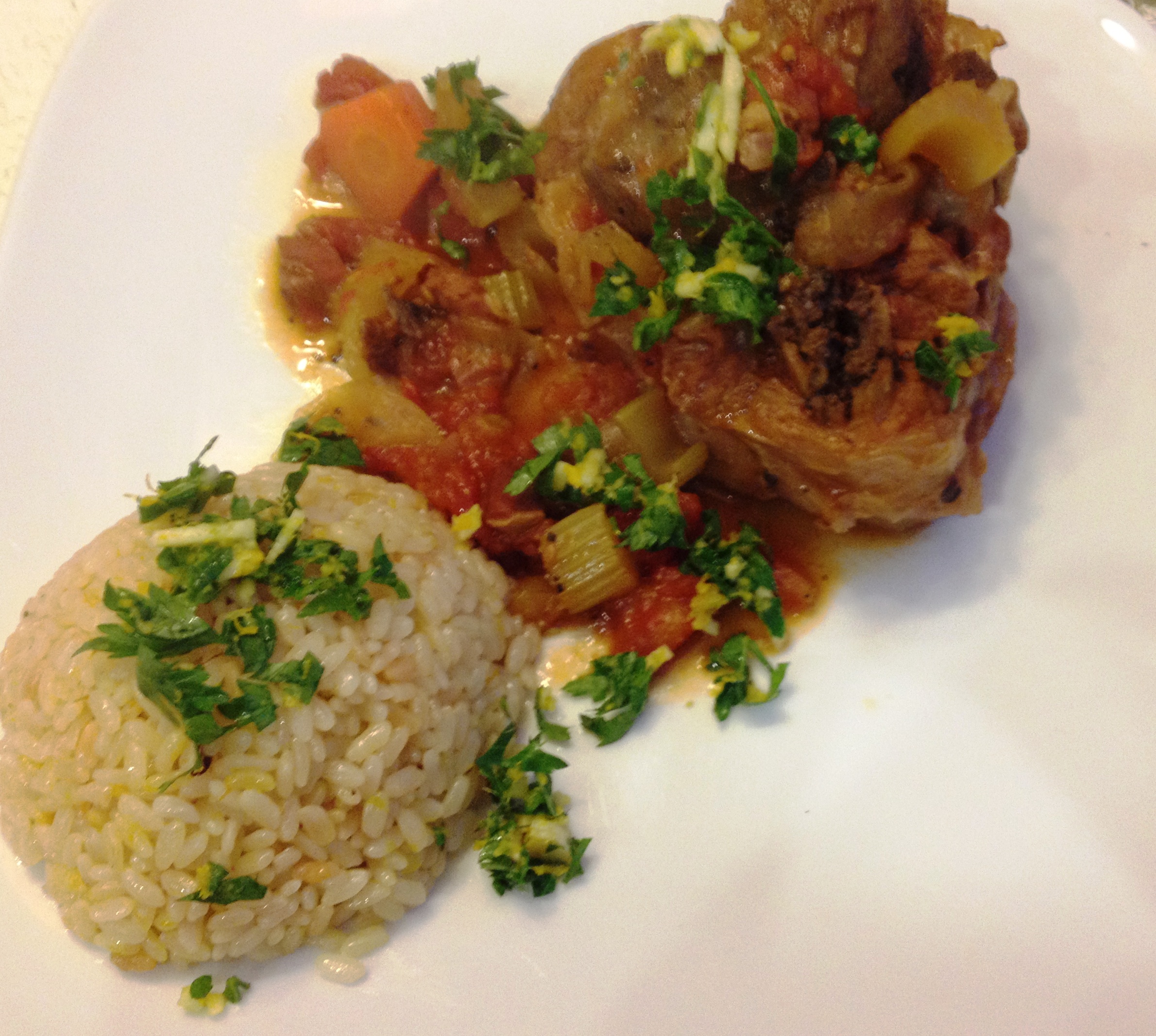 Obraz 014Ossobuco podajemy z risotto, które podlewamy winem, bulionem i sosem, który powstaje z pieczenia pręg cielęcych. Sos zawiera w sobie szpik, który wypływa z medalionów w trakcie zapiekania i daje nieziemski i jedyny w swoim rodzaju smak.